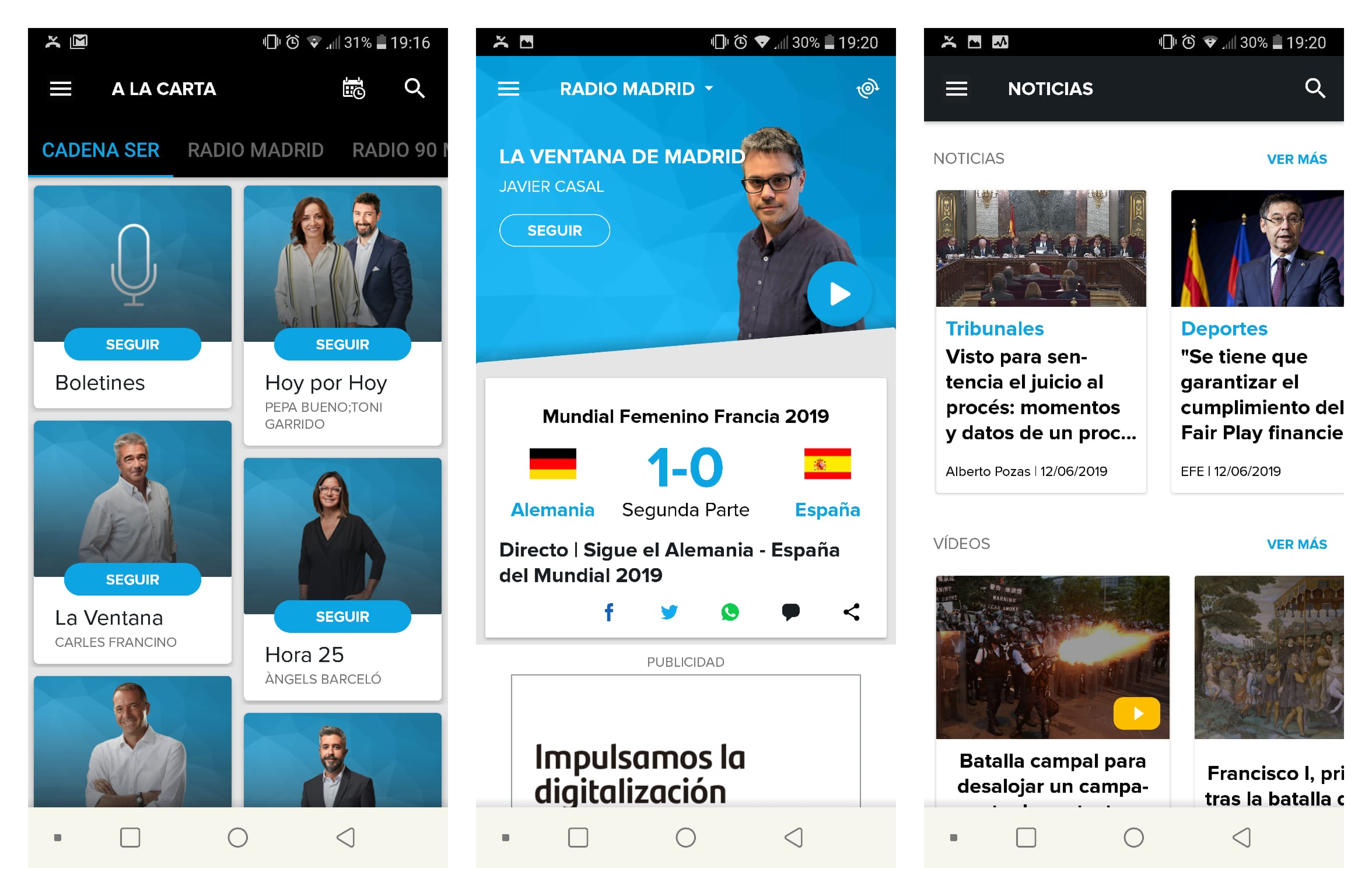 - Swiping to the left the user accesses to all the content that Cadena SER produces, ordered by topic and with a powerful searcher to help them to discover programs and podcasts.
