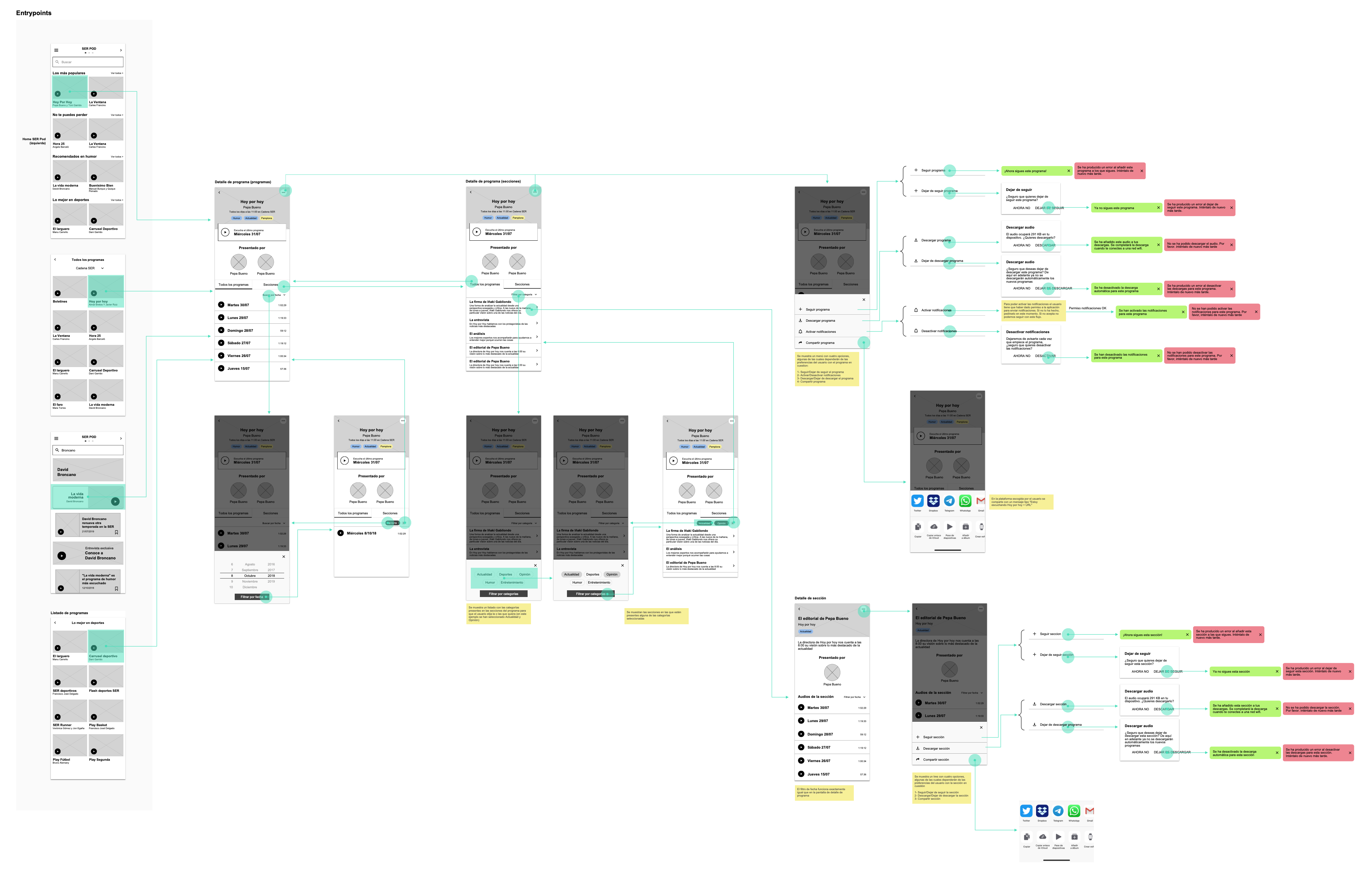From the three spaces idea, we planned all the app navigation, trying to focus in clean the main screens like player and hide the options in a deeper level.