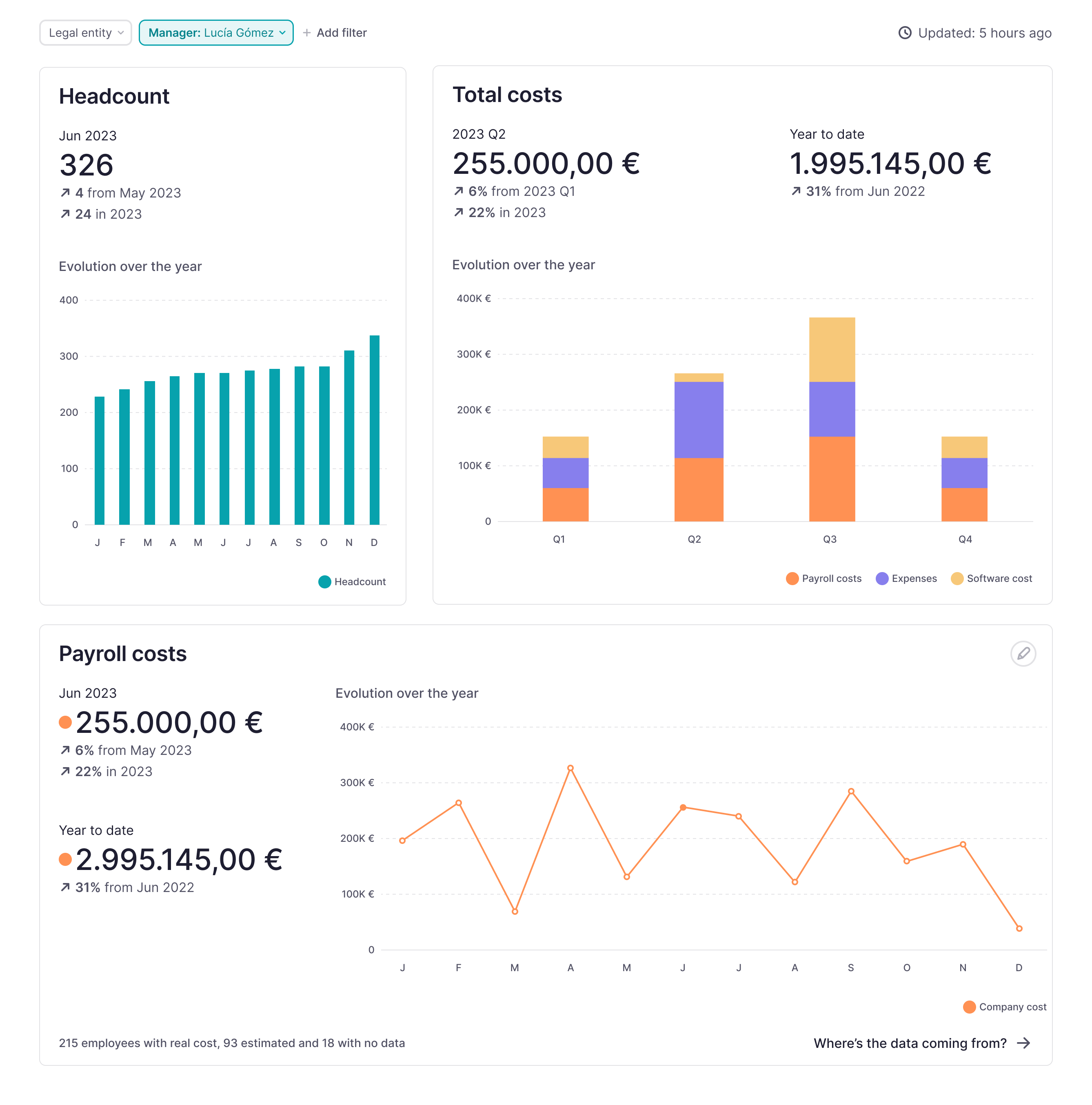 - Company costs: Shows how much the company spent in the last month (payroll related), in the current fiscal year and the evolution.