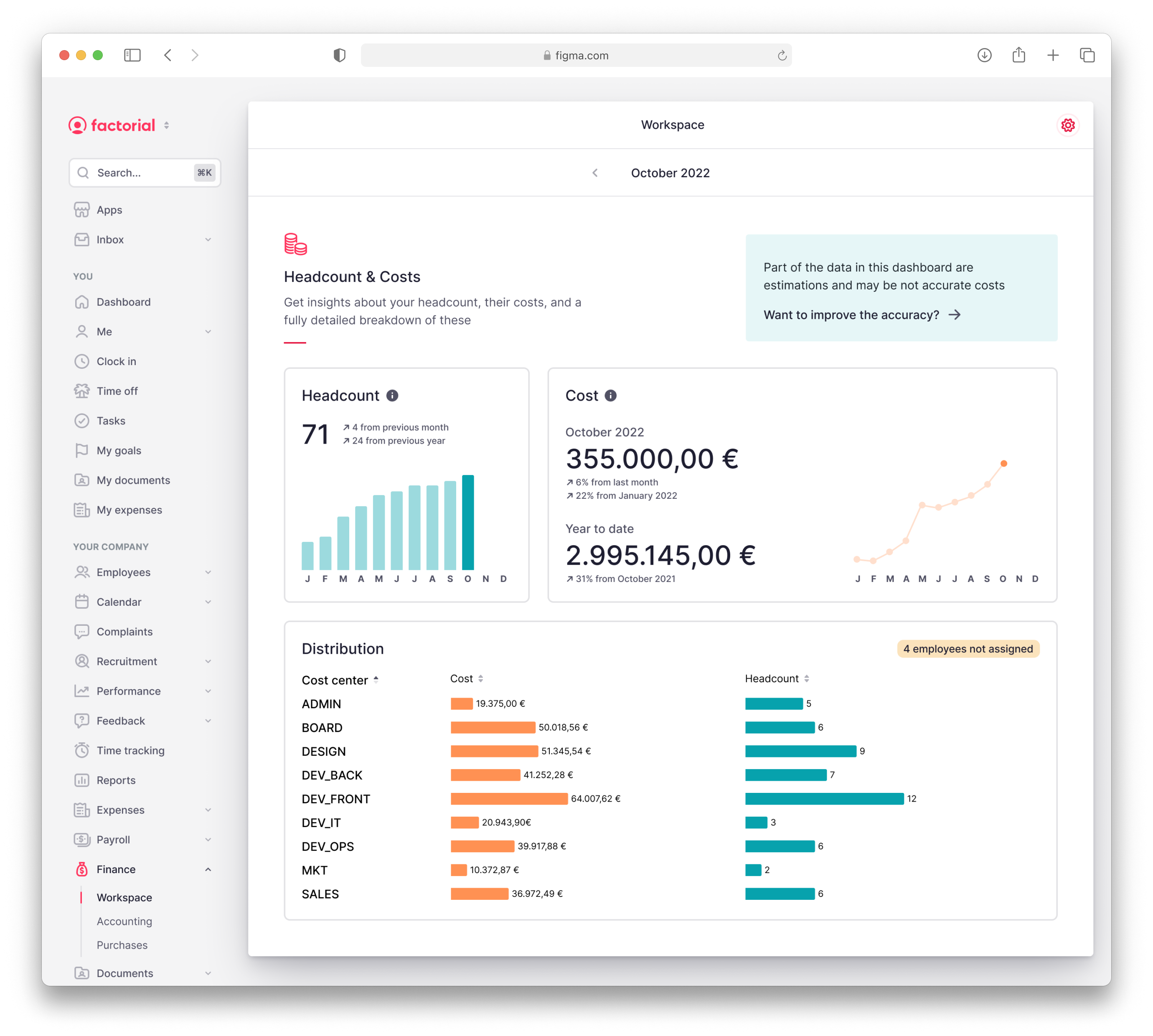 Other than payroll we always had another cost datasource in Factorial: the Expenses management module. The Workspace belongs to a bundle of modules related to Finance, so most of the companies that were paying for the Workspace also had the Expenses management module. This module didn’t offer much information about insights related to expenses and companies were asking us to see this data aggregated in the Workspace.